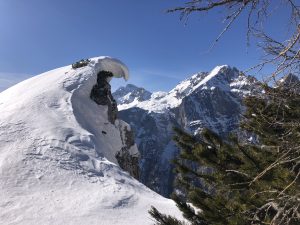 - Harde wind kan ook leiden tot de vorming van corniches. Dat zijn kammen van sneeuw die over een piek of kam heen hellen. Als je deze vanachter benadert zie je ze eenvoudig over het hoofd. Erop staan kan tot instorting leiden. Bijgevoegd een foto van een kleine corniche ter indicatie met de Triglav erachter. Kom dus nooit te dicht bij afgronden.